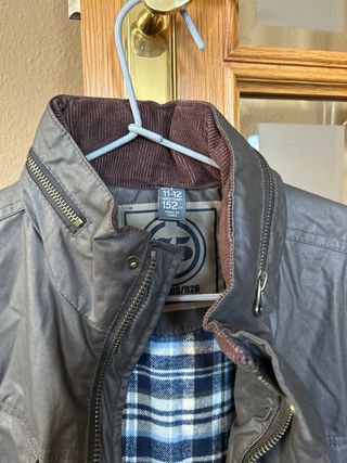 Chaqueta marrón verdoso encerada estilo barbour impecable. Tiene capucha escondida en cremallera y funciona todo perfectamente, cremallera y corchetes