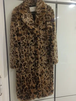 Abrigo efecto pelo estampado de leopardo. Cierre botones, dos bolsillos delanteros. Ancho hombros 42 cm, ancho de sisa a sisa 50 cm, largo desde espalda 83 cm. Impecable