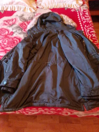 Chaqueta tipo parka para mujer con un llamativo forro interior. - Diseño con capucha y pelo sintético. - Cierre de cremallera y botones. - Cintura ajustable con cordón. - Bolsillos frontales con solapa y cremallera.
