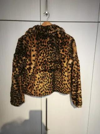 Chaqueta de pelo con estampado de leopardo. - Diseño de pelo sintético. - Cierre de corchetes. - Tiene muy poco uso pero la parte de piel (de estar guardada en un armario) está un poco pelada según se ve en las fotos. No se ve con la chaqueta puesta.