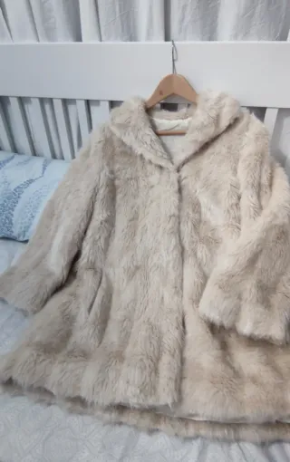 Abrigo de pelo sintético con un diseño elegante y moderno. Su tacto es muy suave y agradable. - Color beige con detalles marrones. - Talla L.