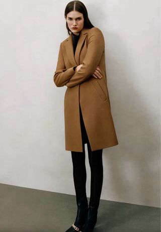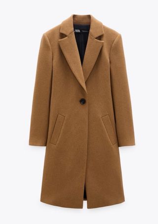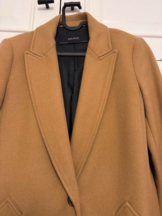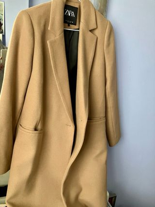 Elegante abrigo de Zara en color camel. Un básico atemporal para cualquier armario. - Diseño clásico con solapas. - Bolsillos frontales. - Cierre de botón.