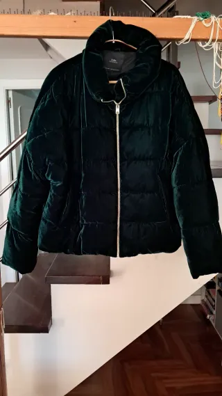 Elegante chaquetón de terciopelo en color verde. Se encuentra en perfecto estado. - Material: Terciopelo suave al tacto. - Diseño acolchado. - Cuello alto. - Cierre de cremallera frontal.