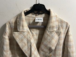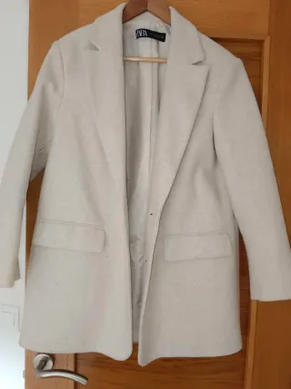 Americana de Zara en color beige, con un corte oversize. - Diseño de solapa. - Bolsillos frontales. - Botón de cierre. Es larga por el culete estilo abrigo de paño ..puesta 3 veces está nueva.