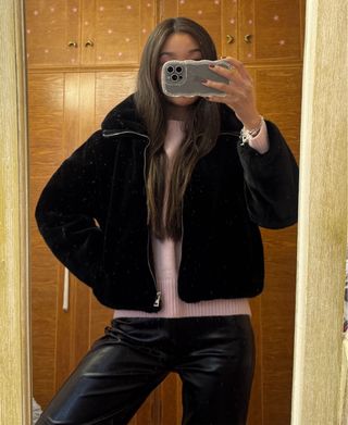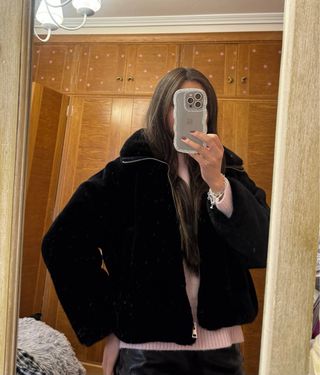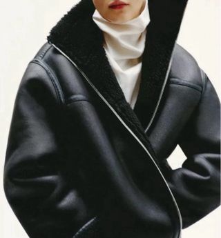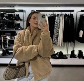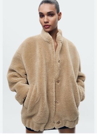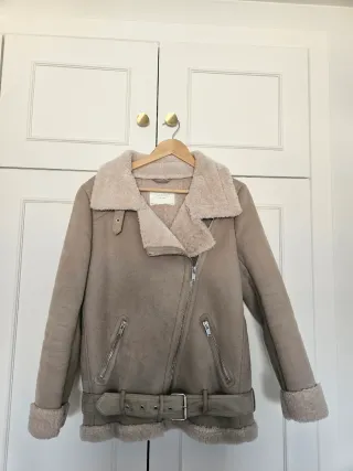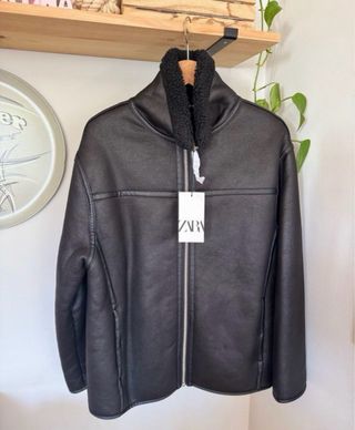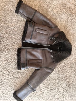Abrigo estilo aviador de Zara, ideal para el frío. - Exterior en imitación piel marrón. - Forro interior de borreguito beige. - Cuello y puños con pelo sintético. - Cierre de cremallera frontal.