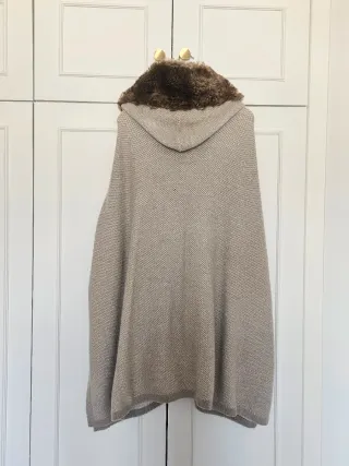 Abrigo tipo capa de punto con un diseño moderno y elegante. Perfecta para añadir un toque de estilo a cualquier atuendo. - Capucha con detalle de pelo sintético. - Cierre de cremallera frontal. - Bolsillos laterales. - Tejido texturizado.