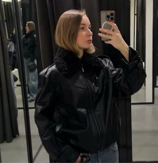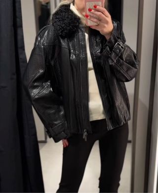 Cazadora de piel negro de Zara con un diseño moderno y atrevido. - Cuello con tachuelas plateadas. - Cierre de cremallera. - Bolsillos con cremallera. - Cinturón con hebilla.