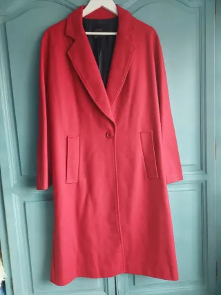 Abrigo elegante de color rojo, perfecto para añadir un toque de color a tu armario. Dos usos, y recién salido de la tintorería. Largo:109 cm. Ancho de sisa: 59 cm. Con forro. - Diseño clásico con solapas. - Cierre de un botón. - Bolsillos frontales. - Forro interior.
