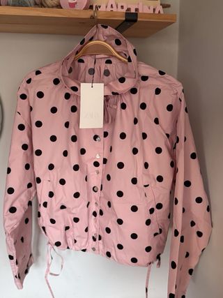 Chaqueta de Zara con un diseño de lunares muy favorecedor. Es una prenda llamativa y con estilo. - Diseño de lunares negros sobre fondo rosa. - Cuello con lazada. - Mangas largas abullonadas. Modelo agotado muy buscado . Solo envios