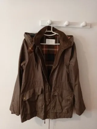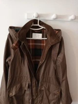 Parka chaqueta tipo Barbour en color verde con ribetes de antelina marrón. Cuenta con cinturón ajustable a la cintura y múltiples bolsillos.