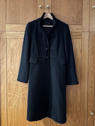Tejido de buena calidad (80% lana, 20% nylon) con forro interior. Abrigo entallado talla M, pero talla algo pequeño (más cercano a una S/M).” Medidas aproximadas: Hombros: 40 cm Cintura: 40 cm Diseño elegante con cuello alto y cierre decorativo tipo oriental que le da un estilo muy especial. Corte entallado con ligera caída en la parte inferior y detalle en la espalda. Estado muy bueno, bien cuidado y sin desperfectos visibles.