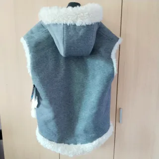 Chaleco de borrego con un diseño moderno y cálido. - Exterior de punto gris. - Forro interior de borrego blanco. - Acabado con ribete de borrego en cuello, mangas y bajo.