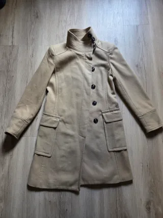 Abrigo elegante de ZARA en color beige. Presenta un diseño moderno con cuello alto y cierre de botones. - Cuello alto con detalle acanalado. - Cierre frontal con botones oscuros. - Dos bolsillos frontales con solapa. - Corte entallado.