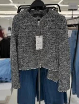 Elegante abrigo de tweed de Zara con un diseño moderno y detalles únicos. - Diseño de doble botonadura. - Acabado con flecos en puños y bajo. - Detalle de perlas en los botones.