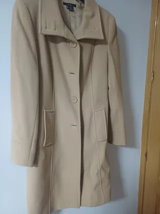 abrigo color beige con cuadros oscuros pequeños, cuello solapa, cierre con dos botones, bolsillos delanteros frontales con solapa, talla xs pero da mas talla, muy poco uso, como nuevo