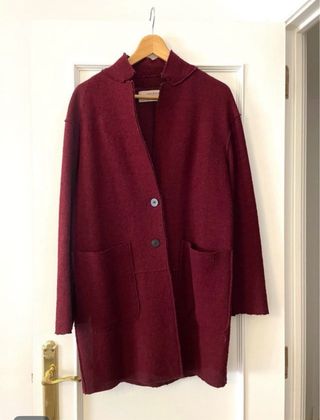 Chaquetón de punto en color burdeos. - Cierre con dos botones. - Dos bolsillos delanteros. - Cuello con solapa. - Largo 85cm