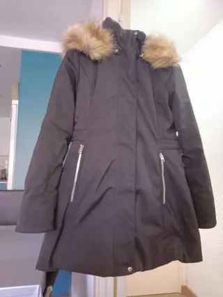 Abrigo tipo parka de Zara, ideal para el frío. - Capucha con detalle de pelo. - Cierre de cremallera. - Bolsillos laterales con cremallera.