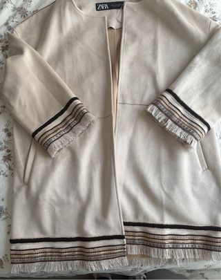 Chaqueta de Zara con un diseño moderno y detalles únicos. - Efecto ante suave al tacto. - Adornos de flecos en puños y bajo. - Diseño abierto sin cierre.