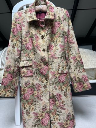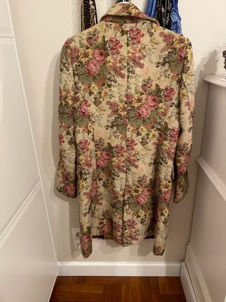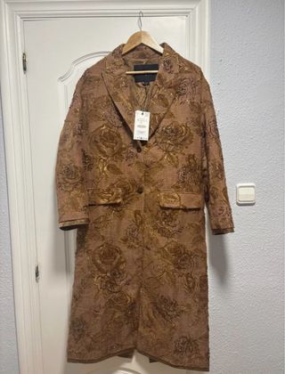 Elegante abrigo largo de Zara, edición limitada. - Diseño con estampado floral en tonos dorados. - Tejido con textura y detalles brillantes.