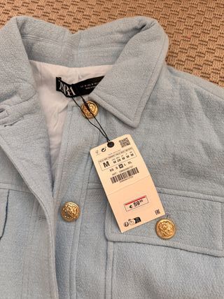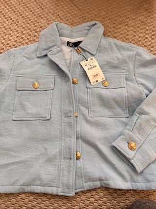 Chaqueta de la marca Zara, con un diseño elegante y moderno. - Cierre de botones dorados. - Bolsillos frontales con solapa. - Cuello camisero.