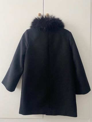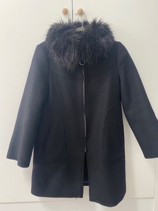 Abrigo negro con cuello de pelo de Zara - Cierre de cremallera frontal. - Cuello de pelo extraible - Bolsillos laterales. en uno de ellos se mota desgaste por uso ( adjunto foto) - Manga ligeramente acampanada y a la altura de la muñeca - Buen estado