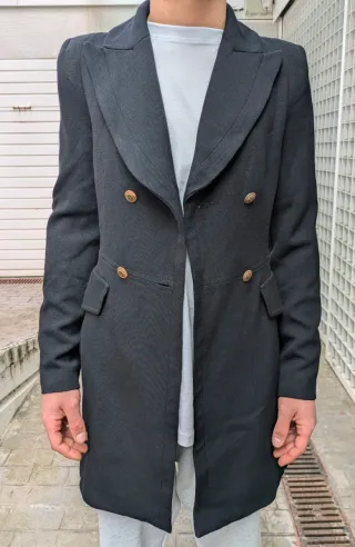 Chaqueta larga de la marca Zara en color negro. Diseño moderno y versátil. - Cierre de botones. - Bolsillos frontales. - Cuello camisero.
