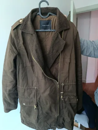 Chaqueta estilo militar de Zara en color verde oliva. Presenta un diseño moderno y funcional. - Cierre de botones. - Dos bolsillos en el pecho. - Cintura ajustable con cordón. - Puños con botón. esta nueva lo único que tiene un poco desteñido el cuello (ver fotos) abrigada