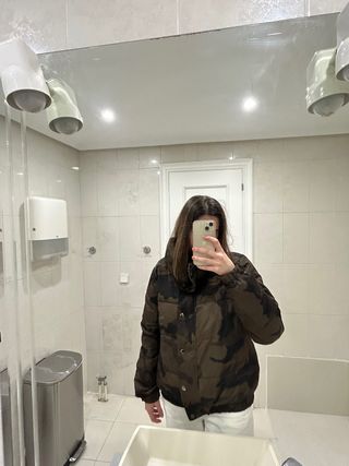 Abrigo con estampado de camuflaje de Zara. - Diseño acolchado. - Cierre de botones. - Cuello alto.