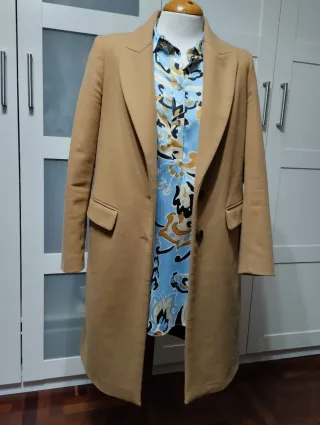 Elegante abrigo de Zara en color beige, perfecto para cualquier ocasión. De largo medio, ideal para combinar tanto con looks casuales como formales. Diseño de botones cruzados con botón interior, que aporta un ajuste cómodo. Es talla S y está prácticamente nuevo, apenas sin usar.