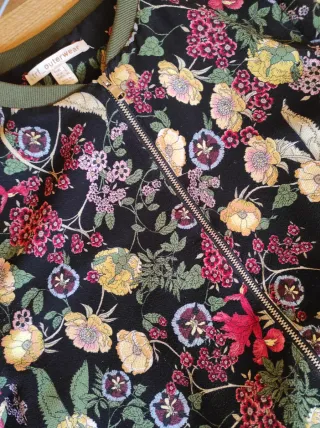 Chaqueta bomber de Zara con un llamativo estampado floral.Pantalon verde polipiel. - Diseño con cuello redondo y cierre de cremallera. - Puños y bajo elásticos. - Tejido ligero y cómodo.