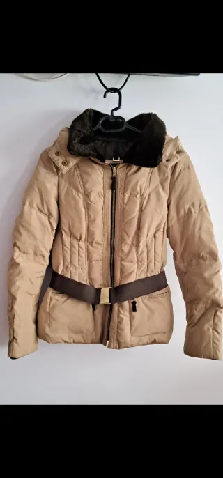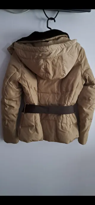 Chaqueta de Zara en color beige con detalles en marrón. Presenta un diseño acolchado y un cinturón a juego. - Capucha desmontable. - Cuello con pelo sintético. - Cierre de cremallera. - Cinturón con hebilla dorada algun rayón.