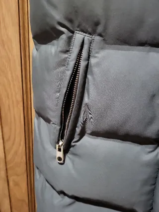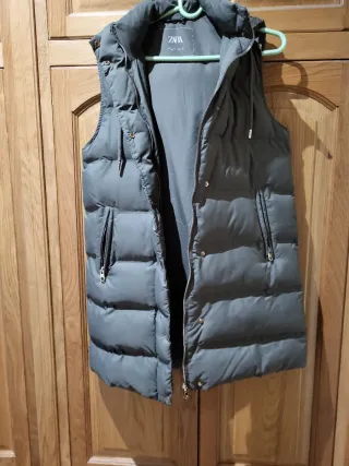 Chaleco largo acolchado con capucha de Zara. Cierre de cremallera y botones a presión. - Dos bolsillos laterales con cremallera. - Cordones ajustables en la capucha. Como se aprecia en la última foto tiene un pequeño descosido