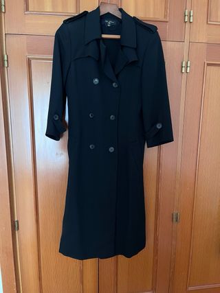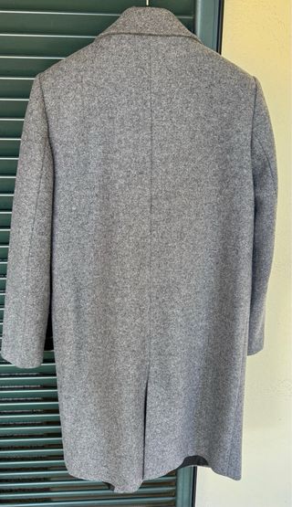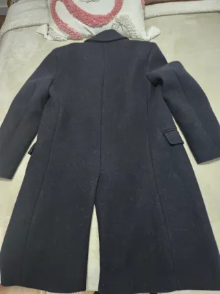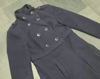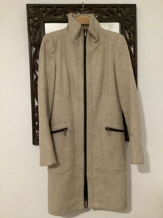 Abrigo largo de lana con cuello alto y cremallera frontal. Talla S - Diseño elegante. - Bolsillos con cremallera. Corte clásico de fondo de armario.Ligeramente entallado. Es ligero pero abriga mucho porque tiene un 63% de lana. Forro negro en la parte interior. Perfecto estado. Lo vendo porque me queda estrecho.