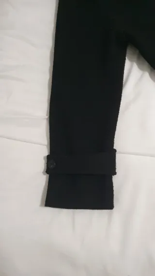 Abrigo largo básico, para cualquier ocasión. Cierre con botones. Cuello solapa. Bolsillos laterales. Totalmente forrado. Aberturas en puños muy originales. Abierto por detrás, está nuevo, no se ha usado nunca, tiene el cosido en abertura, ver foto. Largo 115, hombros 46, pecho 52, ancho 64. 70% lana, 30% poliamida. Forro viscosa. Incluye botón de repuesto.
