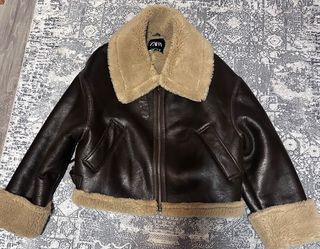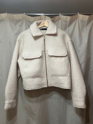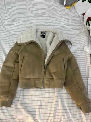 Chaqueta estilo aviador de Zara con un diseño moderno y cálido. - Exterior en color beige. - Forro interior de pelo sintético blanco. - Cuello con solapas de pelo. - Cierre de cremallera frontal. - Puños y bajo elásticos.