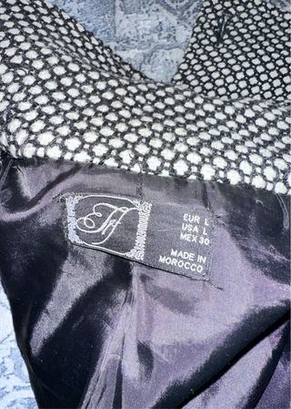 Abrigo de pelo sintético con un llamativo estampado de parches en blanco y negro. Su diseño texturizado le da un toque único y moderno. Zara. Perfecto estado - Diseño de pelo rizado. - Estampado de parches. - Manga larga.