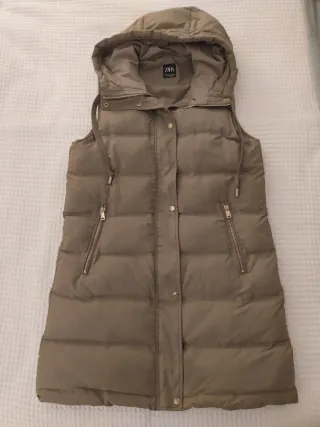 Chaleco largo plumífero de Zara con capucha. - Cierre de cremallera y botones a presión dorado. - Bolsillos laterales con cremallera. - Cordones ajustables en la capucha.