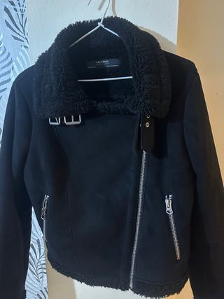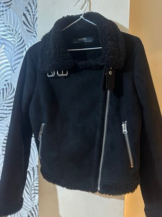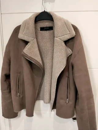 Cazadora de efecto ante con forro interior de borreguito. Valida para tallas S y M, como nueva. - Cierre de cremallera. - Bolsillos laterales con cremallera. - Cuello solapa con forro.