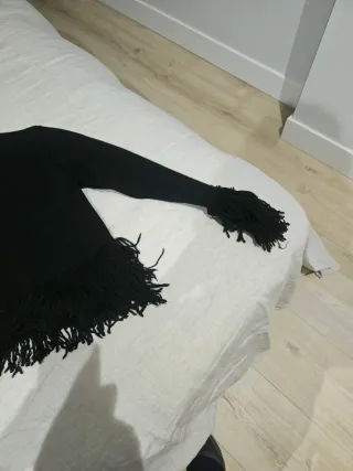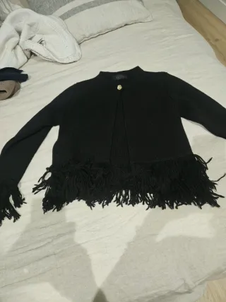 Chaqueta de punto con un diseño moderno y detalles de flecos en el bajo. Cierre con un botón dorado. - Manga larga. - Cuello redondo. - Adorno de flecos. - comprada en Portugal y como no se podia cambiar en España quité la etiqueta. Nunca usada