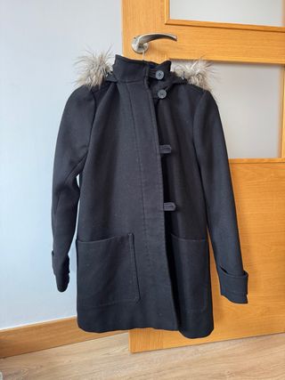Elegante abrigo de Zara con un diseño clásico y detalles modernos. - Confeccionado con 75% de lana para mayor calidez. - Cuello con acabado de pelo sintético. - Dos bolsillos frontales con solapa y botón dorado. - Cierre de botones dorados. - Forro interior. - No tiene bolitas