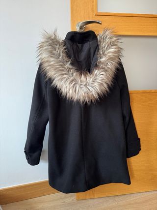 Abrigo de invierno de Zara con detalles de pelo en la capucha. - Cierre de botones. - Bolsillos delanteros. - Diseño moderno.