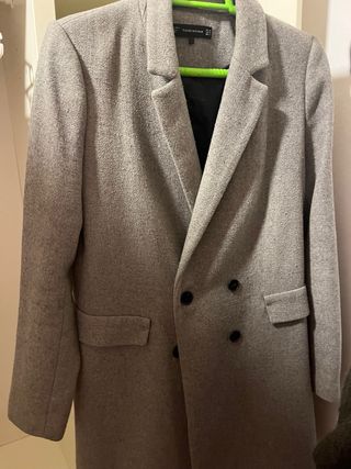 Abrigo de paño de Zara en color gris. Un básico elegante para cualquier ocasión. Llega por la rodilla - Diseño de doble botonadura. - Bolsillos frontales. - Cuello solapa.