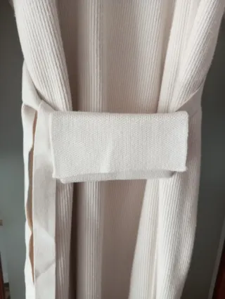 Abrigo largo de lana en color beige. Es una prenda cómoda y versátil. - Tejido de punto acanalado. - Cinturón a juego para ajustar. - Diseño abierto.