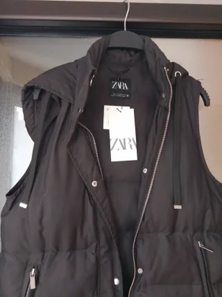 Chaleco largo acolchado de Zara, ideal para añadir una capa extra de abrigo. - Diseño largo y moderno. - Capucha integrada. - Cierre frontal con cremallera. - Bolsillos laterales con cremallera.
