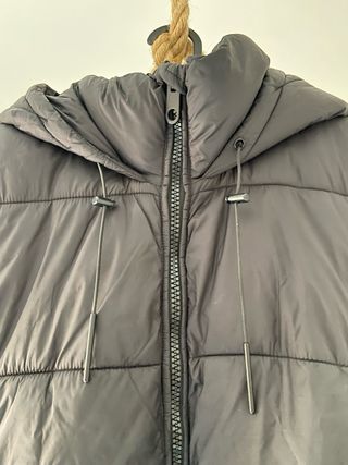 Chaleco largo acolchado de Zara. - Cierre de cremallera. - Bolsillos laterales con cremallera. - Capucha integrada. - Cordones ajustables en la cintura. -Largo 80cm