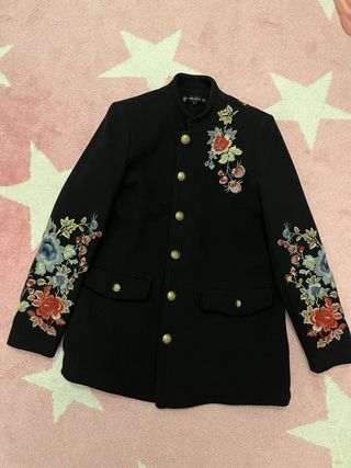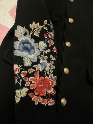 Elegante chaqueta negra de Zara con un diseño floral bordado. Abrigo mujer Zara XL negro con bordados y botones. Sin etiqueta pero solo se usó un día. No es mi talla - Bordados florales en mangas y frontal. - Cierre de botones dorados. - Cuello mao.