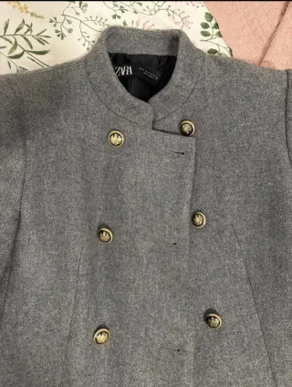 Elegante abrigo de Zara con un diseño clásico y detalles militares. - Color gris jaspeado. - Cierre cruzado con botones dorados. - Cuello mao. - Dos bolsillos laterales.