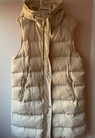 Chaleco largo de polipiel en color beige de Zara. Tiene capucha y cierre de cremallera. - Bolsillos laterales con cremallera. - Cierre de botones a presión en la parte delantera.
