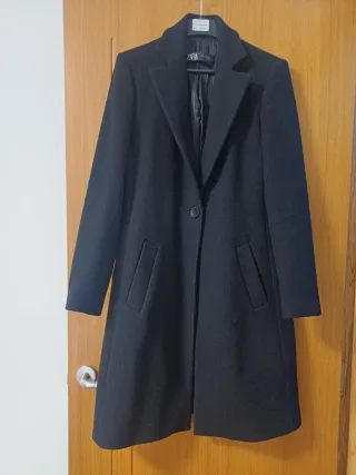Elegante abrigo largo de Zara. - Diseño de doble botonadura con botones dorados. - Cuello solapa clásico. - Bolsillos frontales con solapa.