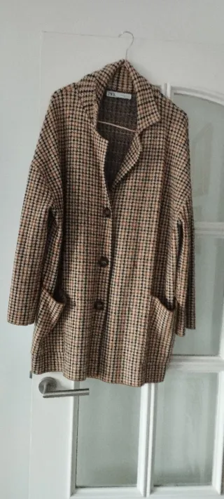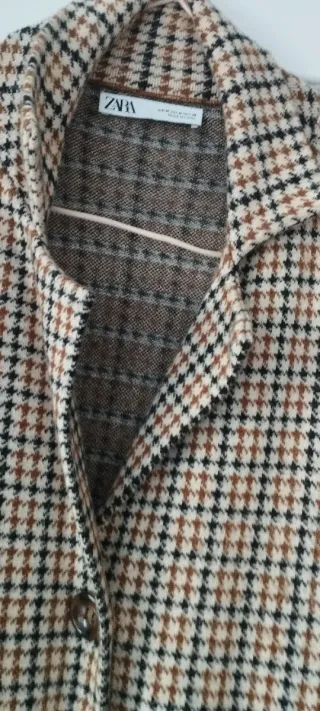 Abrigo de cuadros de la marca Zara. - Diseño de cuadros en tonos verdes, rojos y marrones. - Corte clásico. - Ideal para un look casual o elegante.